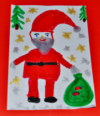 2. Mikołaj malowany czerwoną farbką plakatową i pastą do zębów, głównie rączkami i paluszkami, z workiem, wśród śniegu idzie, przynieść prezenty wszystkim dzieciom. Autor: Julia